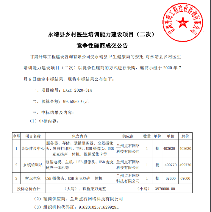 蘭州點石網(wǎng)絡科技有限公司近日捷報頻傳,在2020年7月6日憑借良好的公司信譽和可靠的技術力量,成功中標“永靖縣鄉(xiāng)村醫(yī)生培訓能力建
